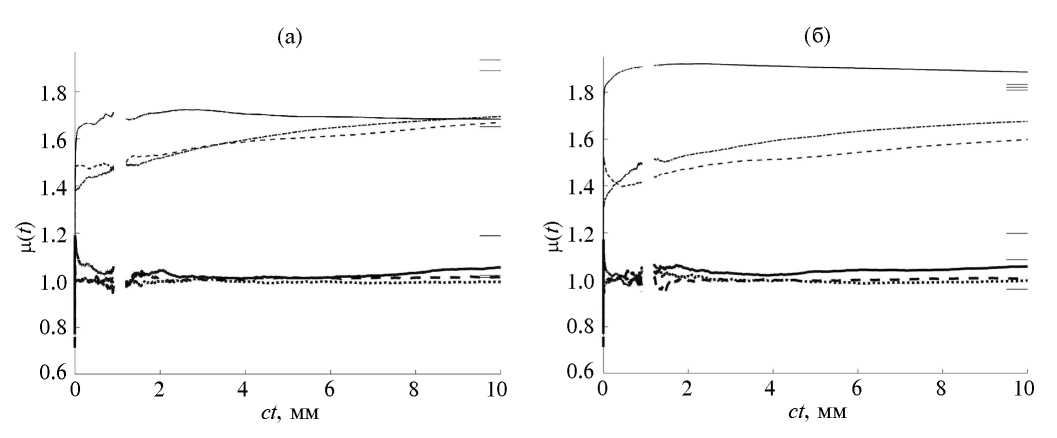 На рис. 5 приведены кривые зависимости для всех исследованных значений , рассчитанные по формуле (12) для мм (разрывы на кривых соответствуют исключенной области малых знаменателей в (12) вблизи t0). Во второй и четвертой колонках (для вариантов различных начальных условий соответственно) табл. 1 приведены значения , достигаемые при ct →10 мм. Отметим, в частности, что в случае эВ получен показатель для выбора (а) начальных условий и 1.57 для выбора (б), что близко к полученному в [13–15] значению 1.51. Для исследования асимптотического поведения диффузии электронов в поперечной плоскости при больших временах (соответствующих большим глубинам проникновения в кристалл) интерес могут представлять значения µend, соответствующие наклону логарифмических кривых на рис. 3 при ct →10 мм. Эти значения приведены в третьей и пятой колонках таблицы, а также отмечены горизонтальными линиями по правому краю рис. 5а, б.