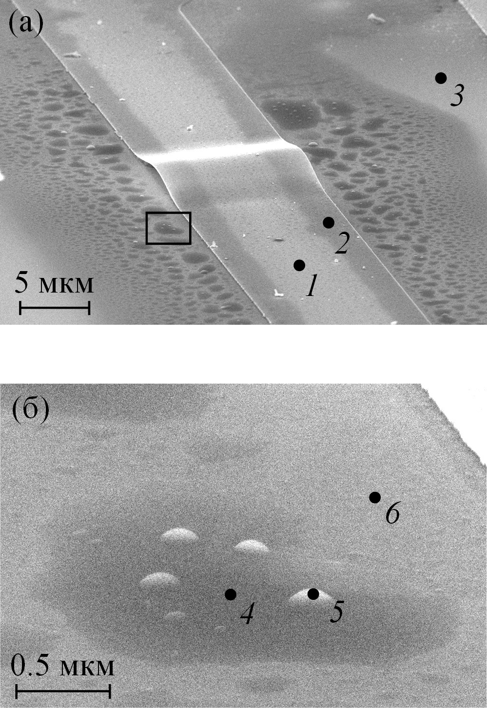 Наряду с образованием структур между электродами изменялась поверхность SiO2 вокруг управляющего электрода и его соединительной дорожки. Это изменение было практически незаметно в оптический микроскоп, но хорошо наблюдалось в РЭМ. Образец показан на рис. 5а. Вокруг дорожки на поверхности SiO2 находится темная область с более темными пятнами внутри. Вблизи дорожки размер пятен достигает 4 мкм и уменьшается по мере удаления от нее. Крупные пятна содержат светлые полусферические структуры размером 100–200 нм (рис. 5б).