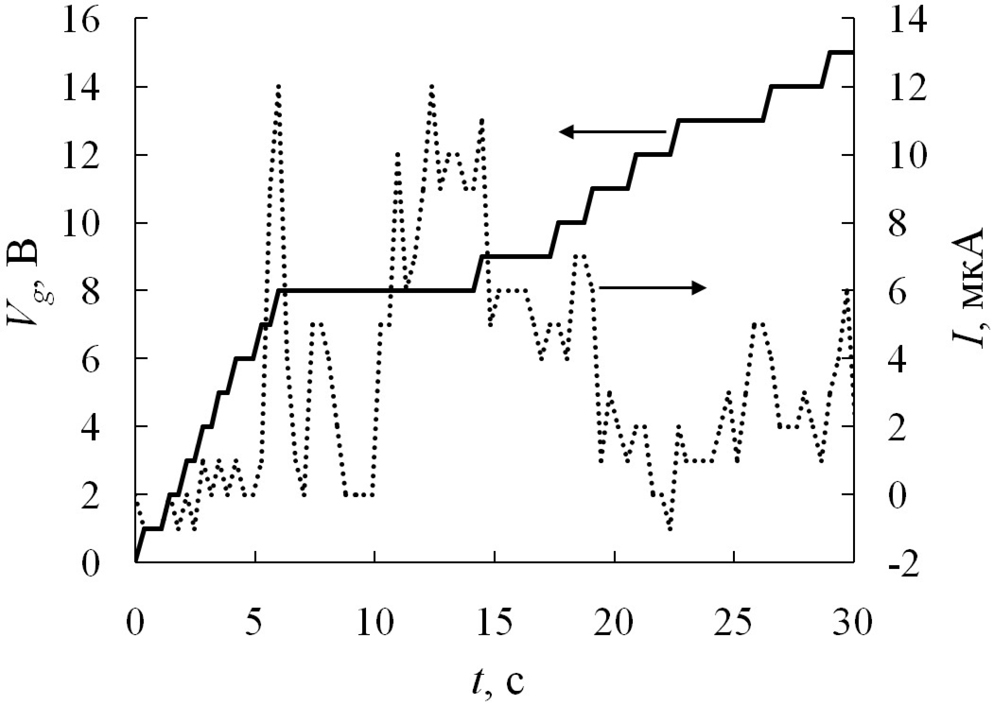 Миграцию хрома можно объяснить диффузией атомов в результате нагрева образца электрическим током. Для оценки температуры был измерен ток, протекающий через электроды в процессе роста структур. Использовали платиновый образец с предварительно сформированными крупными структурами (рис. 4). Сигнальный электрод был заземлен, а потенциал управляющего электрода Vg постепенно увеличивался от нуля до 15 В в течение 30 с (рис. 6). График также иллюстрирует изменение тока I. В течение первых 5 с напряжение увеличивалось от нуля до 6 В, ток не превышал 1 мкА. Подъем Vg до 8 В на шестой секунде вызвал скачок тока до 12 мкА и активировал образование структур в зазоре между электродами. С шестой по пятнадцатую секунды структуры продолжали расти, и происходило отслоение дорожки. В течение следующих 15 с напряжение постепенно увеличивалось до 15 В, но ток не превышал 7 мкА. Таким образом, ток находился на уровне нескольких микроампер, несмотря на присутствие крупных структур в межэлектродном зазоре. Малая величина тока объясняется большим удельным сопротивлением мигрирующего материала.