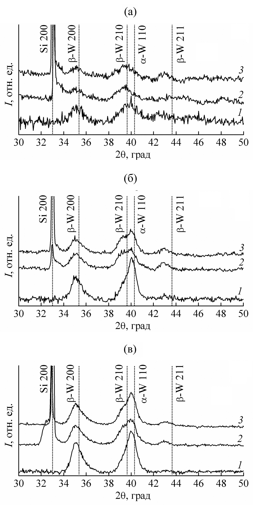 Рис. 1. Дифрактограммы образцов с пленками W толщиной 10 (а), 20 (б), 30 нм (в), осажденными на стекло (1), Si (2), SiO2/Si (3).