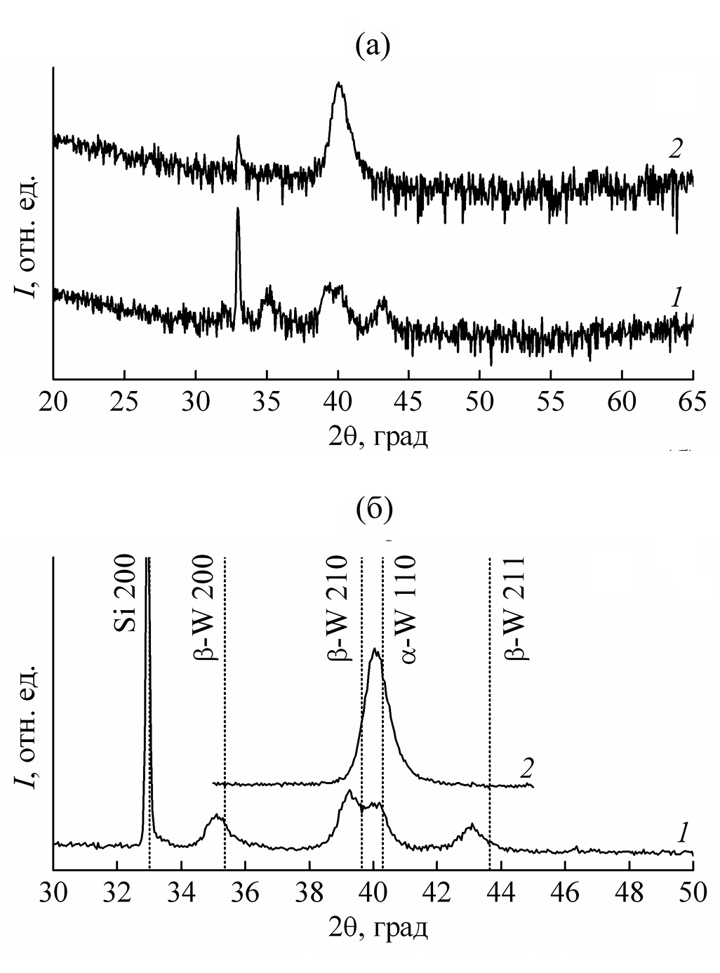 Съемку дифрактограмм в режиме θ–2θ проводили на дифрактометре ДРОН-3М с использованием излучения CuKα при напряжении на трубке 30 кВ и анодном токе 30 мА. Монохроматизацию излучения трубки обеспечивал графитовый кристалл-монохроматор на первичном пучке. Изображения поверхности пленок получены с помощью растрового электронного микроскопа (РЭМ) Supra-40 (Carl Zeiss). Измерения удельного сопротивления ρ пленок W проводили четырехзондовым методом.