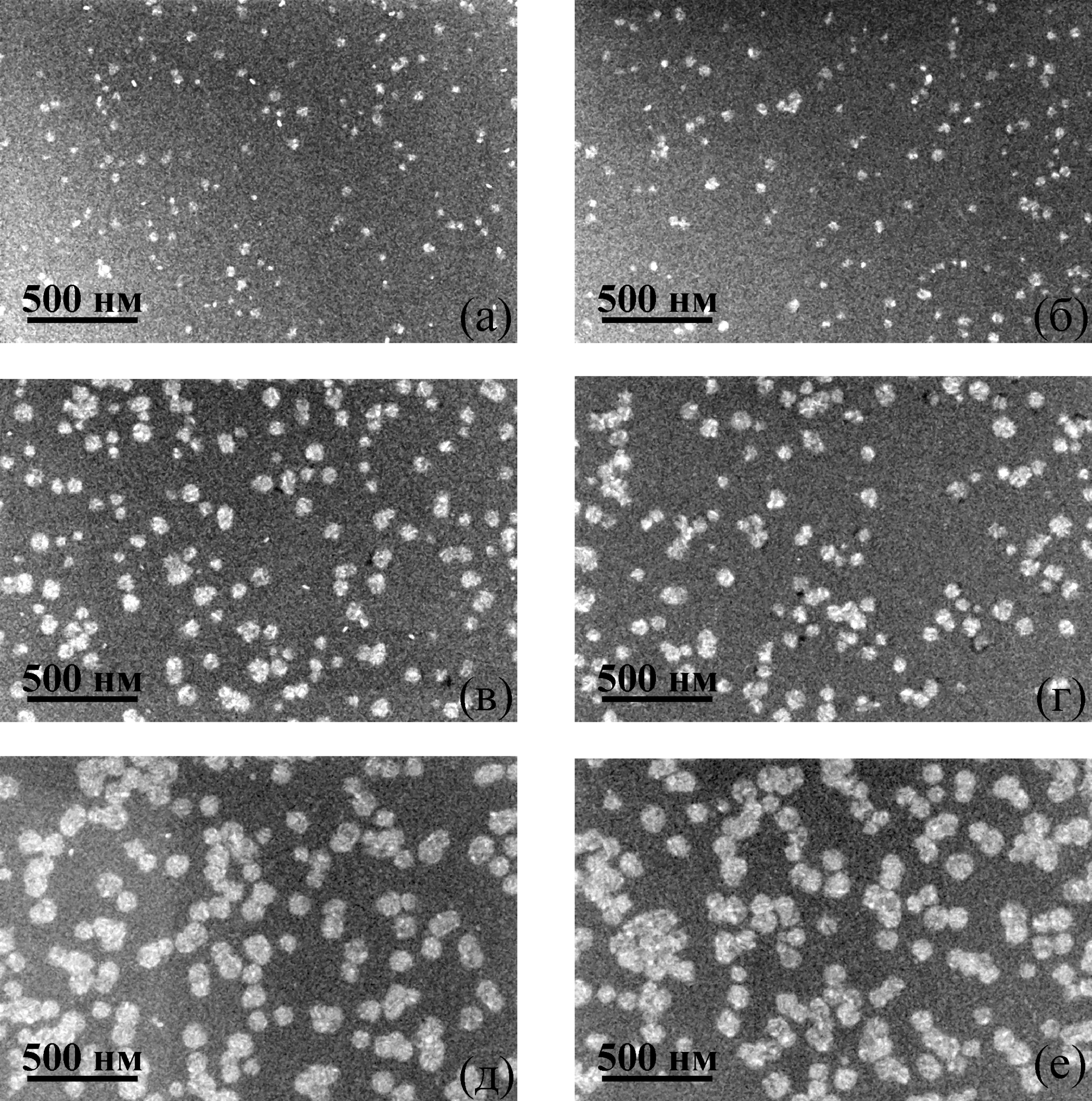 Рис. 3. РЭМ-изображения пленок W толщиной 10 (а, б), 20 (в, г), 30 нм (д, е), осажденных на Si (а, в, д) и на SiO2/Si (б, г, е).