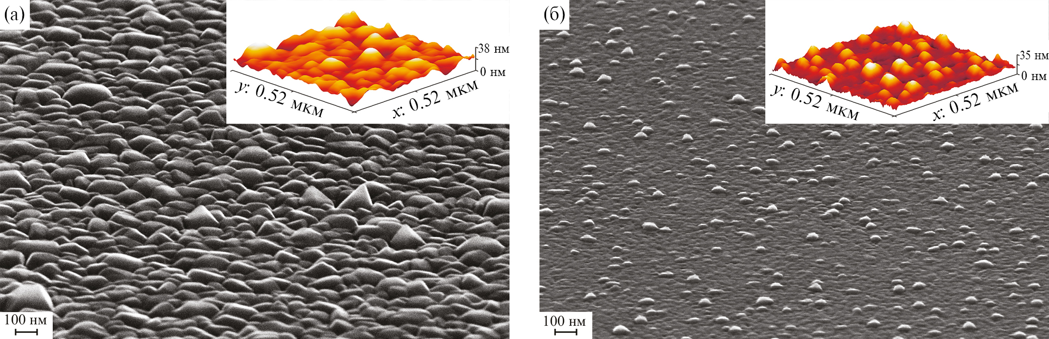 Изучение топографии методом РЭМ показало, что исходные пленки AК1 имеют зернистую структуру со средним размером зерен порядка 80–85 нм, средняя шероховатость поверхности по данным АСМ составляет ~10 нм. Наблюдаются также отдельные участки размером ~100 нм, выступающие на поверхности в виде холмов или пирамид, высота которых составляет ~20 нм (рис. 3а). После полирующего распыления пленок АК1 на глубину 70–80 нм крупные зерна Al должны быть стравлены. На поверхности остаются островки трудно распыляемого кремния, которые проявляются в виде холмов диаметром 20–50 нм и высотой 15–30 нм (рис. 3б). При бомбардировке пленок AК1 ионами Ar+ с энергией, близкой к пороговым значениям распыления Si, плотность этих структур (наноточек) заметно возрастает. Таким образом, изменения топографии, вызванные ионной бомбардировкой, позволяют предположить, что за счет большей скорости распыления Al происходит полировка поверхности, а сформированные наноструктуры состоят из кремния, скорость распыления которого почти в два раза меньше алюминия.