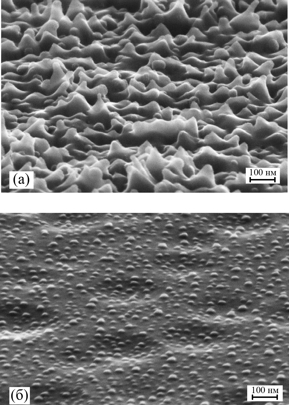 В рамках исследований было установлено, что процессы микро- и наноструктурирования поверхности бинарных халькогенидов свинца индивидуально зависят от энергии бомбардирующих ионов аргона и от кристаллографической ориентации. На рис. 3 в качестве примера приведена типичная морфология поверхности кристаллов PbSe(100) после ионно-плазменной обработки с энергией 50–150 эВ, которая характеризуется наличием высоких конусообразных структур, расположенных на фоне ансамбля полусферических нанокапель с латеральными размерами 10–25 нм. Природа появления таких конусов связана с эффектом микромаскирования мест выхода дислокаций и подробно рассмотрена в [23]. При более высокой энергии ионов на поверхности кристаллов и конусов формируются наноструктуры в форме одинаково ориентированных прямоугольных параллелепипедов, что особенно ярко проявляется в кристаллах теллурида свинца (рис. 4). На рис. 5 показаны различия в морфологии поверхности PbTe(111) и PbSe(111) после обработки ионами с энергией 200 эВ в течение 60 с. Из сравнения изображений (рис. 5а, б) следует более активный процесс наноструктурирования поверхности при плазменной обработке PbTe, что объясняется меньшими значениями поверхностной энергии для теллурида свинца [37, 38]. Сопоставление морфологии поверхности на рис. 4 и 5а показывает различный рельеф для PbTe(100) и PbTe(111), формирующийся в одинаковых условиях обработки. Анализ приведенных на рис. 3–5 изображений подтверждает возможность эффективного варьирования параметров нано- и микрорельефа поверхности монокристаллических структур PbX при ионно-плазменной обработке. Вопросы изменения морфологии поверхности бинарных халькогенидов свинца различных ориентаций будут детально рассмотрены в следующей публикации.