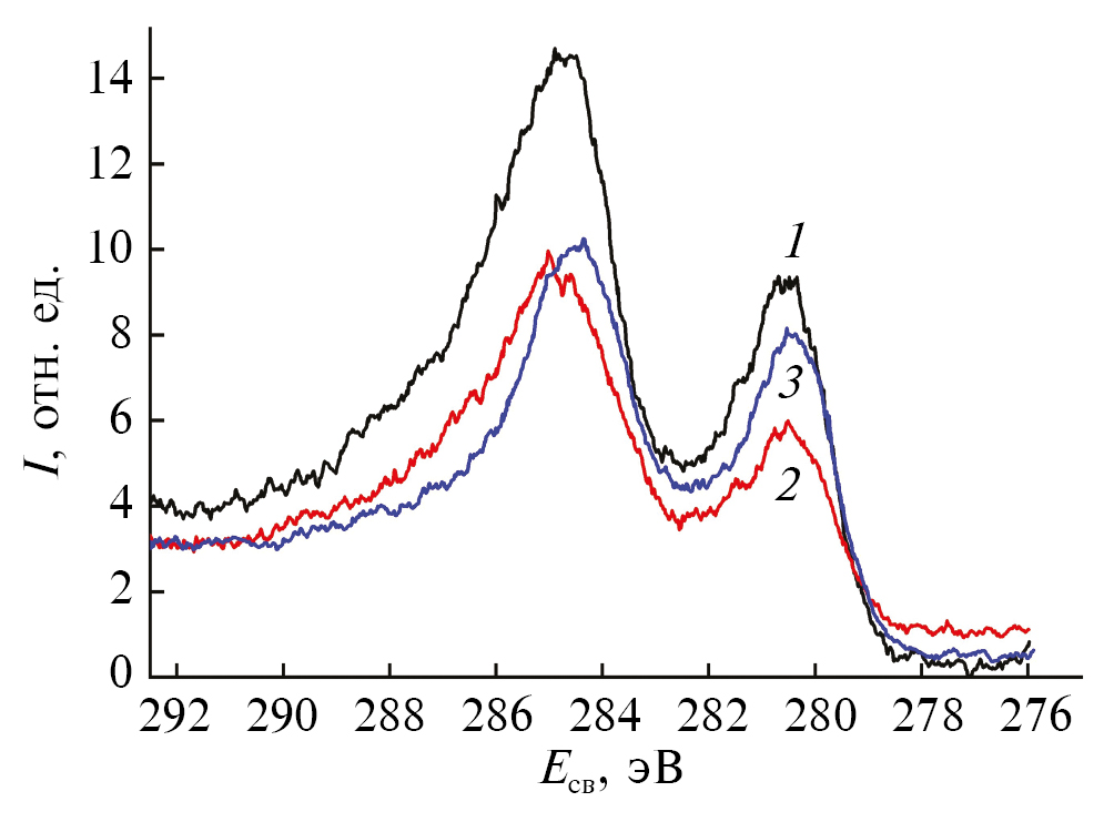 Анализ поверхности исходного образца Ru методом РФЭС показывает, что спектр уровня Ru3d характерен для естественного оксидного слоя RuO2 — наблюдается смещение влево дублетного спектра металлического Ru (рис. 1). Металлический спектр Ru3d (спектр 1) возникал после обработки поверхности ионным пучком аргона. Он состоял из двух спин-орбитальных компонент, относящихся к Ru3d5/2 и Ru3d3/2, при 280.2 и 284.4 эВ соответственно [10, 18]. Компоненты Ru3d диоксида рутения RuO2 были смещены на 0.9 эВ и наблюдались при 281.1 и 285.3 эВ соответственно [8, 18].