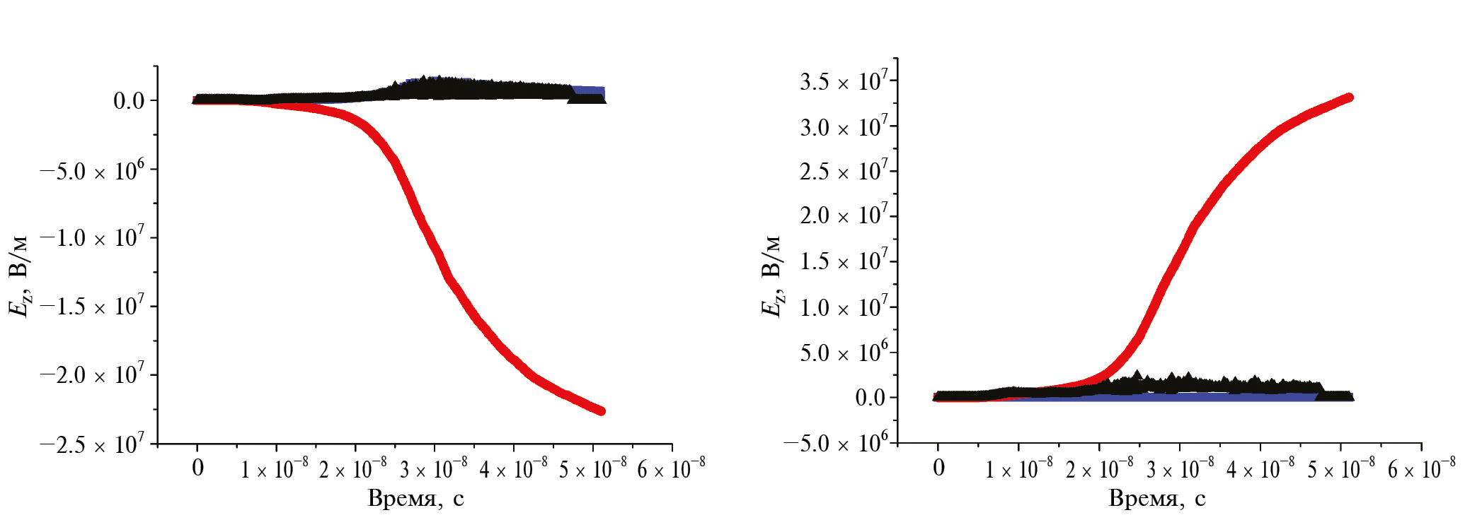 Рис. 4. Зависимость напряженности электрического поля от времени под поверхностью и вблизи поверхности диэлектрика. Синим цветом обозначен первый расчет, красным цветом обозначен второй расчет, черным цветом обозначен третий расчет.