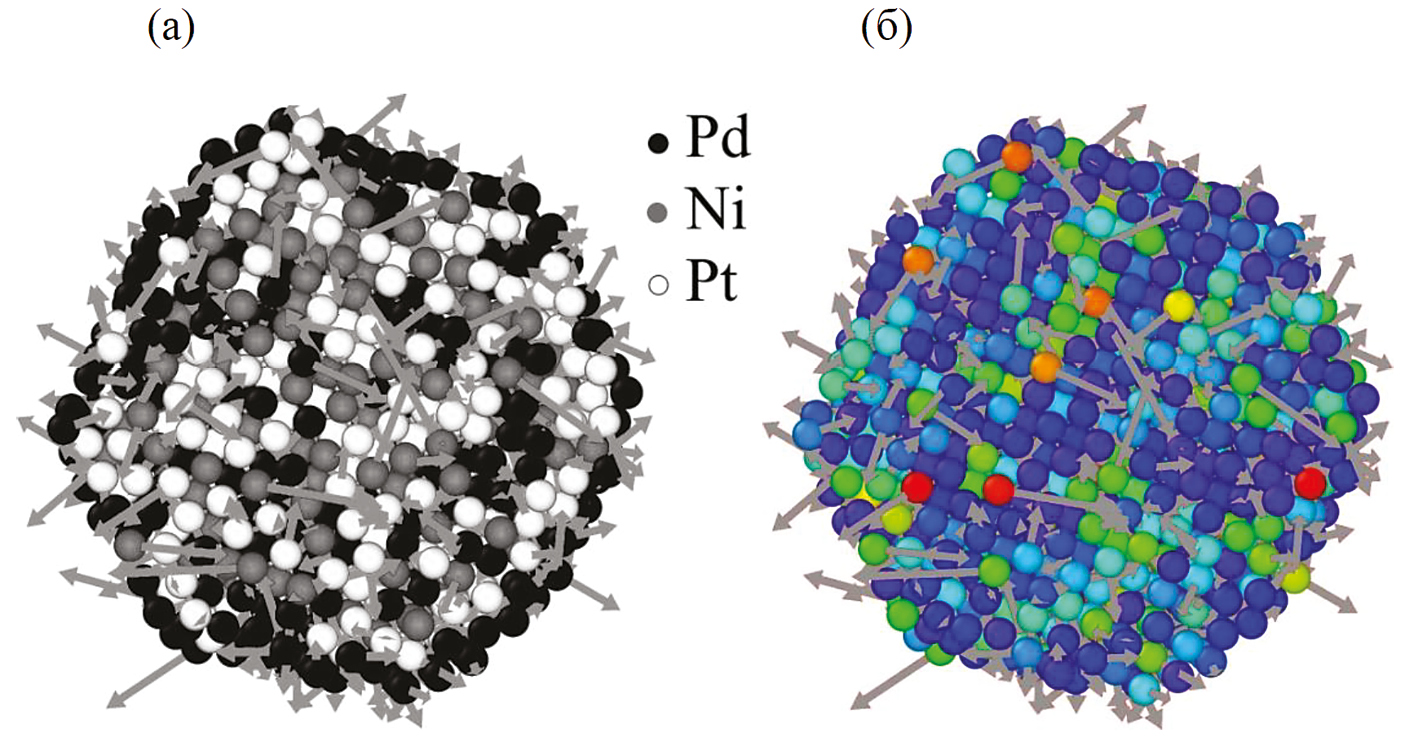 Сравнивая рис. 2в и 2е, можно заключить, что допирование бинарных наночастиц Pt–Pd атомами Ni практически не повлияло на сегрегацию основных компонентов, т.е. Pt и Pd: в обоих случаях наружный монослой представлен атомами Pd. Отдельные атомы Ni и их малые нанокластеры равномерно распределены по объему наночастицы (рис. 2е), т.е. атомы Ni не демонстрируют тенденции к их концентрации в центральной области наночастицы или на ее поверхности.