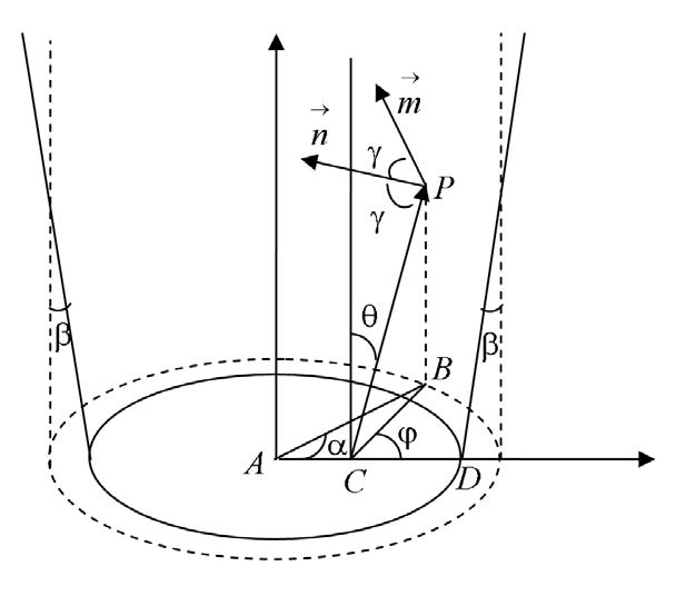 Let us consider the reflection geometry inside a quartz cone cuvette. Figure 3 shows a diagram of the scattered ray propagation in a cone cuvette with an opening angle of 2β. The cone axis is directed upward. The horizontal section of the cone forms a circle with radius and a center at point A. The cone is filled with sea water illuminated from below by a parallel beam. Let the direct light be scattered at point C in a certain direction determined by zenith angle θ and azimuthal angle . The scattered ray intersects with the surface of the cone at heightat pointwhere the ray is reflected back into the medium. A horizontal section of a cone drawn through point forms a circle with radius , where . The circle projection is shown by a dashed line in Fig. 3.