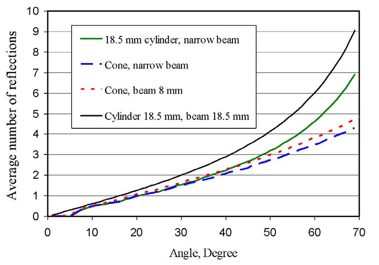 The calculations of the path of scattered rays made it possible to determine that when they propagate in a cone cuvette, half the number of reflections from the cuvette walls occurs than in a cylindrical cuvette (Fig. 4).