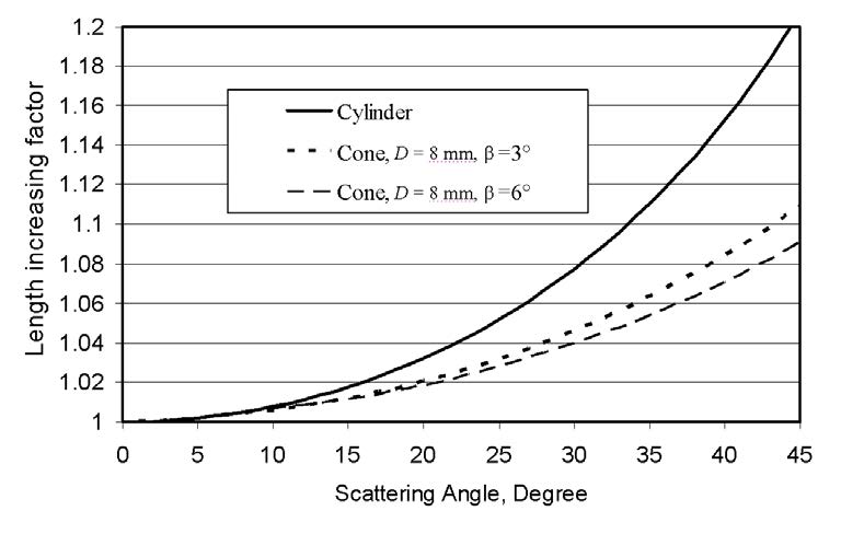 F i g. 5. Coefficient of a path length increase depending on the scattering angle for the cuvettes in the form of a cylinder and cones with the angles 6° and 12°