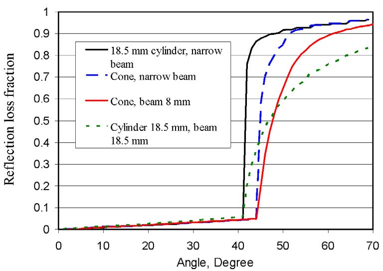 If the processes of reflection, refraction and transmission of light in a thin layer of quartz are neglected, then it can be argued that near the receiving collector such redirection occurs mainly as a result of a single reflection from the cuvette wall. The rays arriving at the collector after double reflection from one part of the wall to the opposite have lower intensity due to strong anisotropy of the scattering indicatrix. From the cuvette entrance to the collector, scattered rays will propagate along a zigzag path from one part of the wall to the opposite by repeated reflection along its entire length. The redirection of scattered rays as a result of single and double reflections in a cylindrical and cone cuvette occurs approximately in the same way, while for multiple reflections there is a significant difference. In a cylindrical cuvette, the propagation of scattered rays as a result of multiple reflection occurs along a uniform zigzag path with the same step. For large scattering angles, the zigzag path becomes so rapid that all rays that reached the cylindrical cuvette interface and did not experience total internal reflection eventually exit the cuvette into the air and are irretrievably lost. In a cone cuvette, the propagation of scattered rays as a result of multiple reflections from the walls occurs along an expanding zigzag path with a gradually increasing step. Accordingly, the scattered rays experience fewer reflections and therefore fewer photons are lost during interactions with the walls of the cone cuvette, as the calculation data in Fig. 6 show.