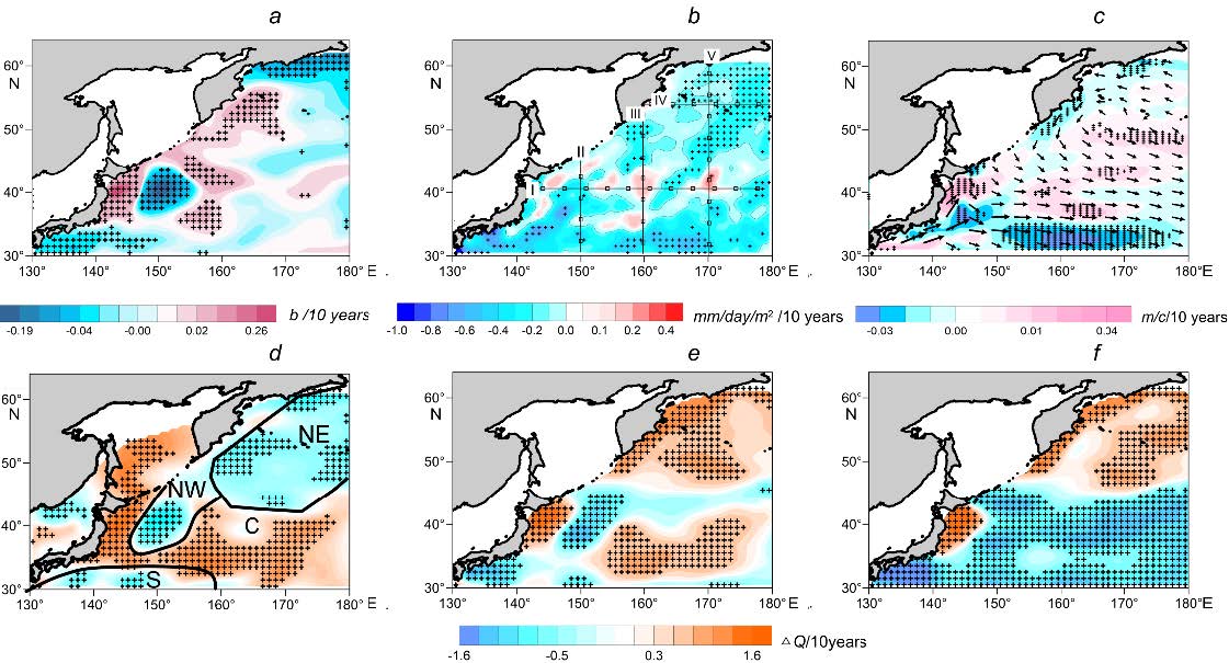 This period was characterized by trends in decreasing precipitation and evaporation from the ocean surface in the southern part of the studied water area with a simultaneous increase in these humidity balance indicators in the north (primarily precipitation – up to 1.0 mm/day/m2 over 10 years during the cold year period). In general, statistically significant negative trends in the evaporation-precipitation difference were observed throughout the region. In addition, significant changes in different indicators of atmospheric and ocean circulation accompanied by increased water exchange in the extratropical zone of the ocean with adjacent areas were observed at this time, which led to the formation of vast volumes of water columns subject to both desalination and salinization with subsequent transformation of water masses.