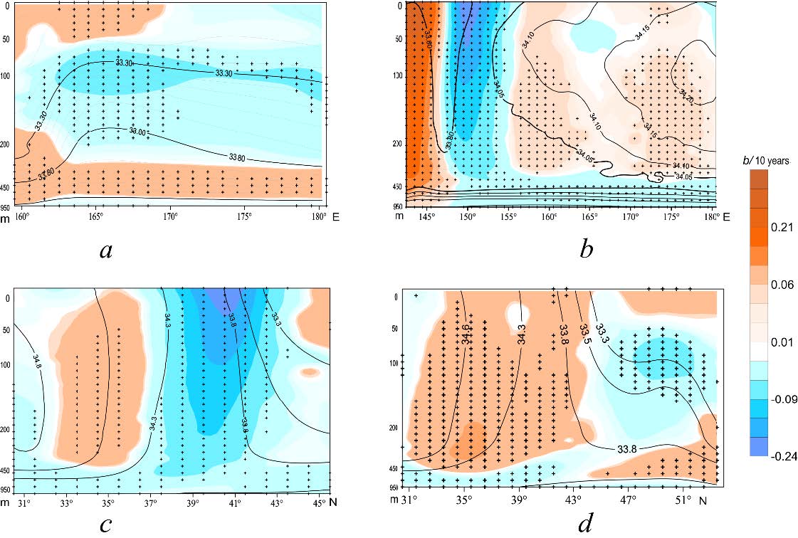 The aforementioned features of stratification – layers (water masses) of high and low salinity associated with their sources of origin – are distinguished in all isohaline field sections. The area of maximum statistically significant negative salinity trends can be observed in northern zonal section IV (Fig. 3, a) in the 100–400 m layer, in the zone of the greatest horizontal salinity gradients on the western boundary of the North Pacific Gyre and the East Kamchatka Current [11, 18]. Significant positive salinity gradients are expressed in the underlying water column of the entire section and in the near-surface layer of the western part of this section, which corresponds to Fig. 1. The vertical structure of the salinity field and its trends is completely rearranged in zonal section I (Fig. 1, b). One desalination zone with the greatest negative trends in salinity is located in the southern part of the selected NW region (148°–155°E) – the convergence zone of desalinated waters of the Kuril and Subarctic Currents – and covers the entire water column of the upper 1000-meter layer. As noted above, to the west of this zone an area with maximum positive trends in salinity and heat content is pronounced, which is formed as a result of increased water exchange with adjacent areas of the eastern part of the Sea of Japan through the Sangar Strait. Another desalination zone can be observed in the deep layer of 460–1000 m throughout the entire length of section I east of 148°E.