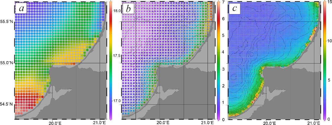 F i g. 2. Summer season mean values of SST (°C) (a), upwelling frequency (multi-year average number of days with negative temperature anomaly per month or season in a given cell) (b), and chlorophyll a concentration (up to 15 mg/m3) (c) in 2000–2019