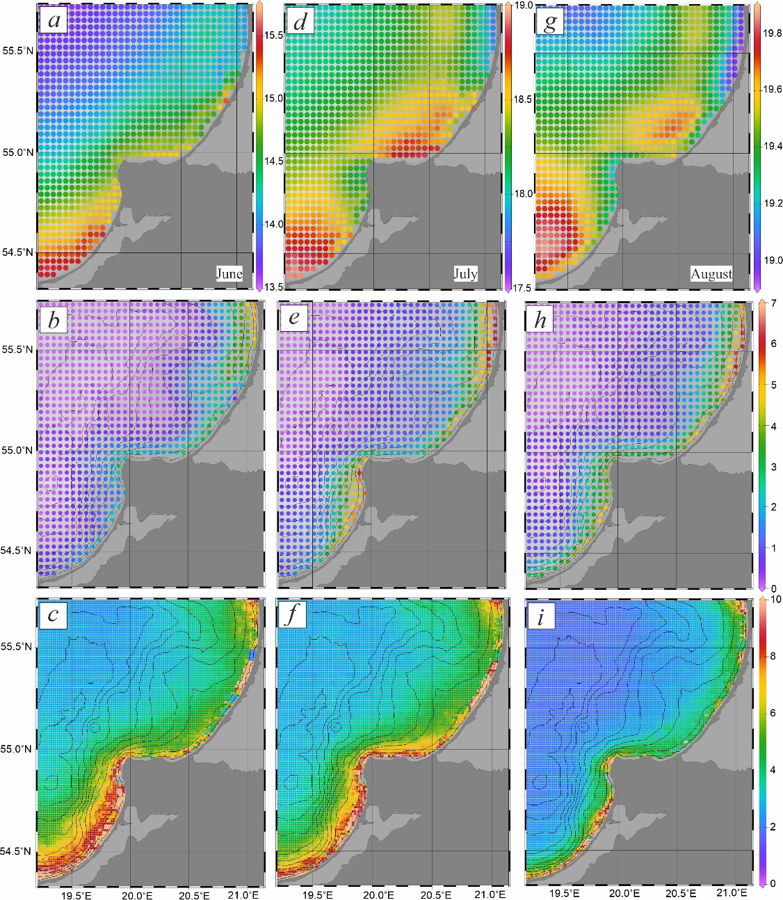 F i g. 3. Intra-seasonal variability of SST (°C) in June (a), July (d) and August (g); upwelling frequency (multi-year average number of the days with negative temperature anomaly per month or season in a given cell) in June (b), July (e) and August (h); chlorophyll a concentration (mg/m3) in June (c), July (f) and August (i) of 2000–2019