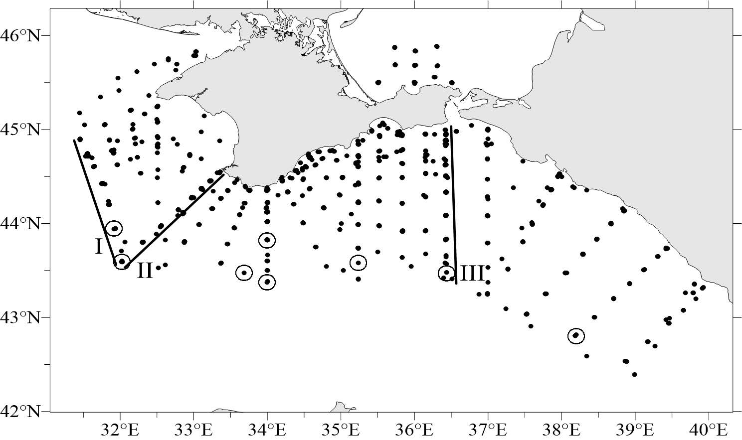 Since November 2015, MHI has carried out systematic comprehensive expeditionary studies of the Black Sea within the economic zone of the Russian Federation, in particular, monitoring the lower boundary of the sub-oxygen zone. The results obtained made it possible to compare these data with the results of individual short-term MHI expeditions of past years [10] and start a detailed analysis of the state of this zone. The features of its upper and lower boundaries in 2015–2016 [11], as well as the causes for the rise of the hydrogen sulfide zone in certain areas of the Black Sea northwestern shelf (NWS) [12], were considered.