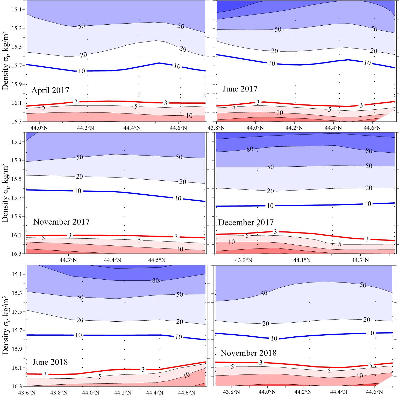 - The position of the sub-oxygen zone upper boundary determined by isooxygen 10 μM was not strictly isopycnal, but within isopycnal interval σt = 15.7–15.85 kg/m3. The deepest location of the upper boundary below σt = 15.8 kg/m3 was observed in November and December 2017, as well as in August 2018.