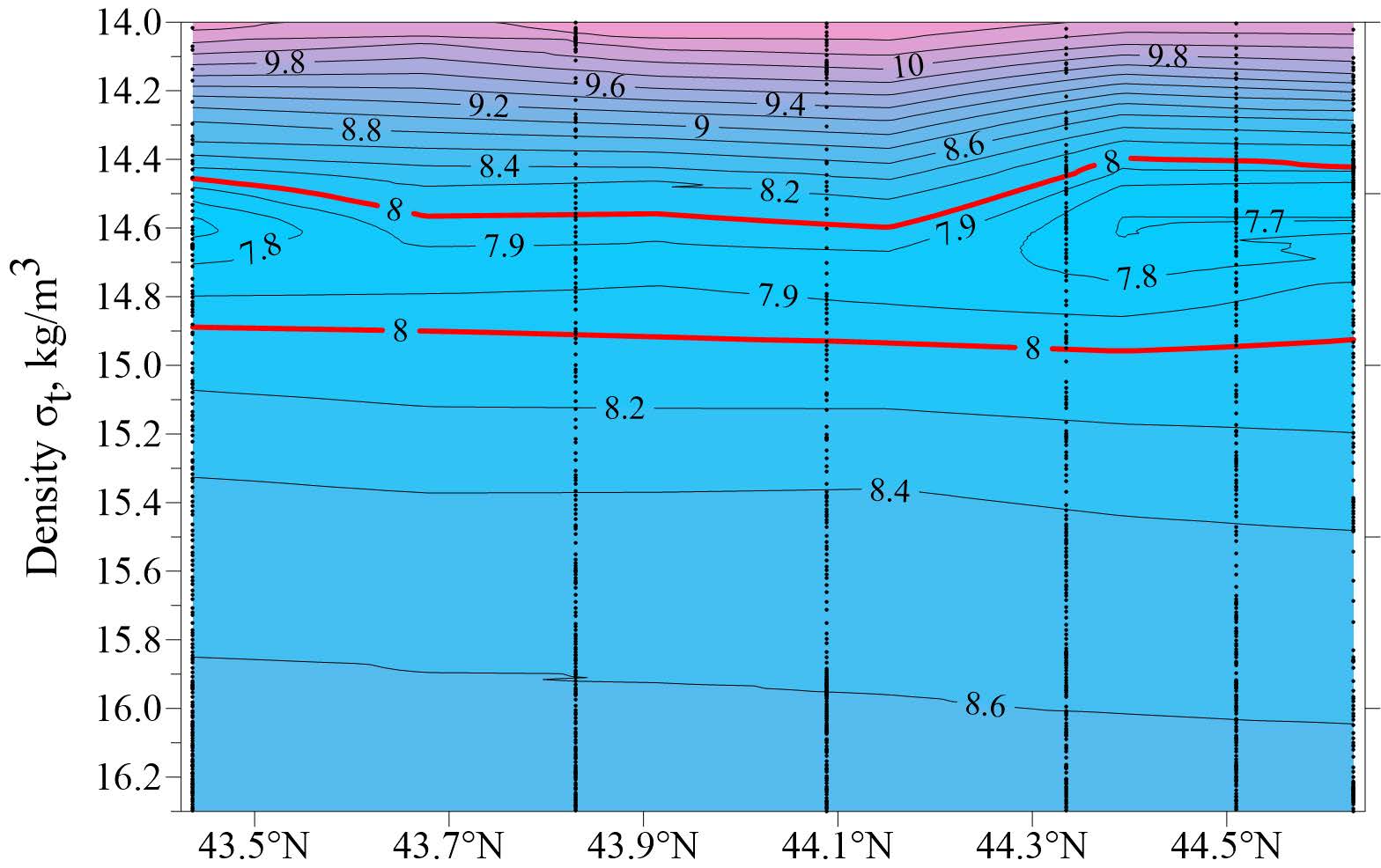 The lowering of isooxygen 10 µM can be explained by the fact that the CIL can be the only oxygen source for the sub-oxygen zone and it becomes clear when considering the temperature vertical distribution in the Kerch section in December 2017 (Fig. 7) that the CIL defined by a temperature of 8ºC was both thicker and colder than the surrounding waters in 44.4º–44.6ºN region. This was the very source of the additional amount of oxygen which was enough not only to oxidize the POM, but also to lower isooxygen 10 µM to st = 15.9 kg/m3.