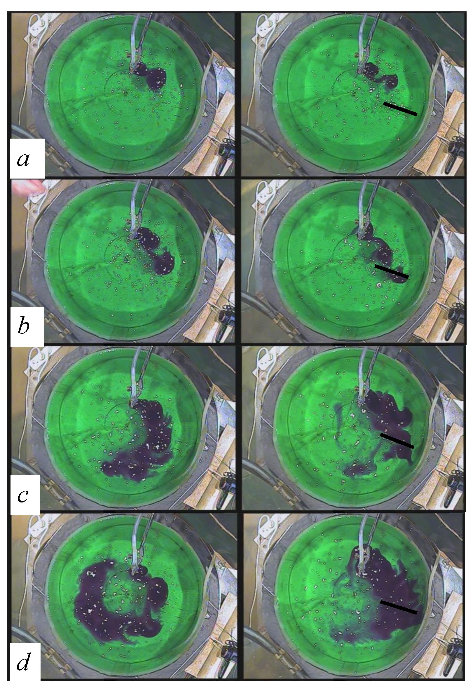 F i g. 3. Experiment with a smooth cone (left) and a ridge on the cone surface (right) (top view) at relation t/T equal to 12 (a); 18 (b); 42 (c) and 66 (d). Salinity of water in the tank S=1‰ (Sources 2, 3)