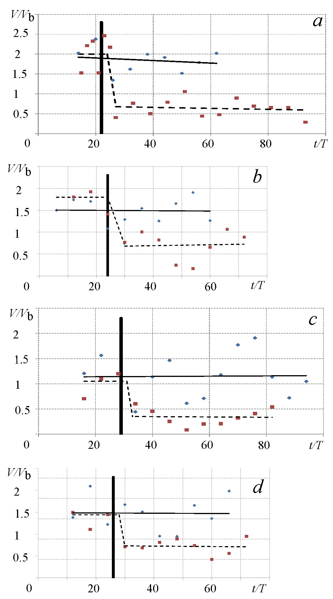 F i g. 4. Dependence of V/Vb on t/T in the experiment with: homogeneous fresh liquid (a) and liquid with salinity S equal to 1 (b), 2 (c) and 4‰ (d). Blue diamonds denote the experiment over the cone with a smooth surface, red squares – the experiment over the cone with a ridge, thick black line shows the moment when the current front crosses the ridge, thin solid line – the trend line for the experiments over the cone with a smooth surface, thin dashed line – the trend line for the experiments over the cone with a ridge (Source 3)