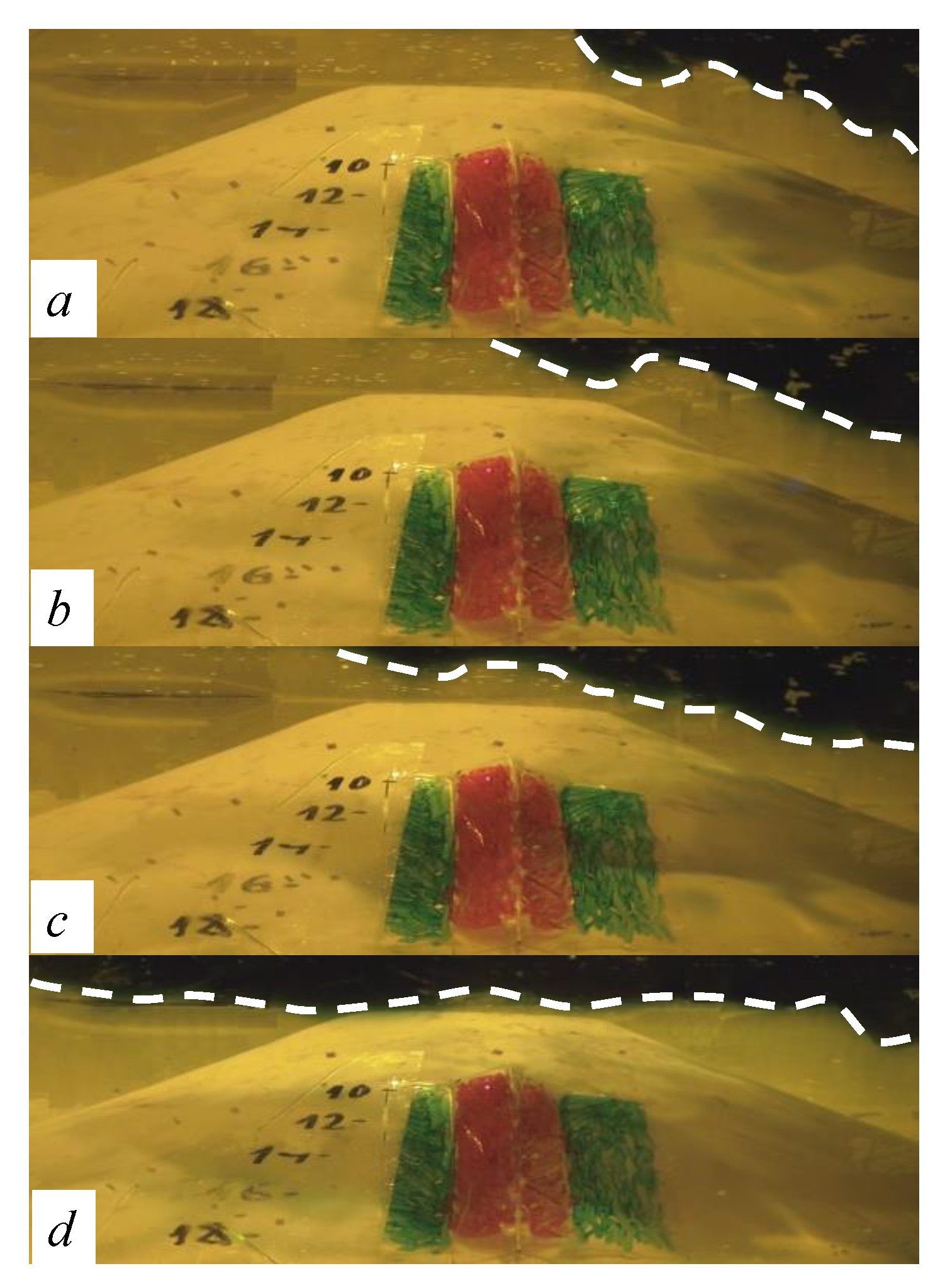 F i g. 5. Baroclinic eddy current (side view) colored blue and moving from right to left over the cone with a ridge (colored red) at t/T equal to 52 (a), 54 (b), 66 (c) and 90 (d). Salinity of water in the tank S=1‰. White dotted line shows the boundary between the upper layer of fresh water and the lower layer of salt water (Sources 3)