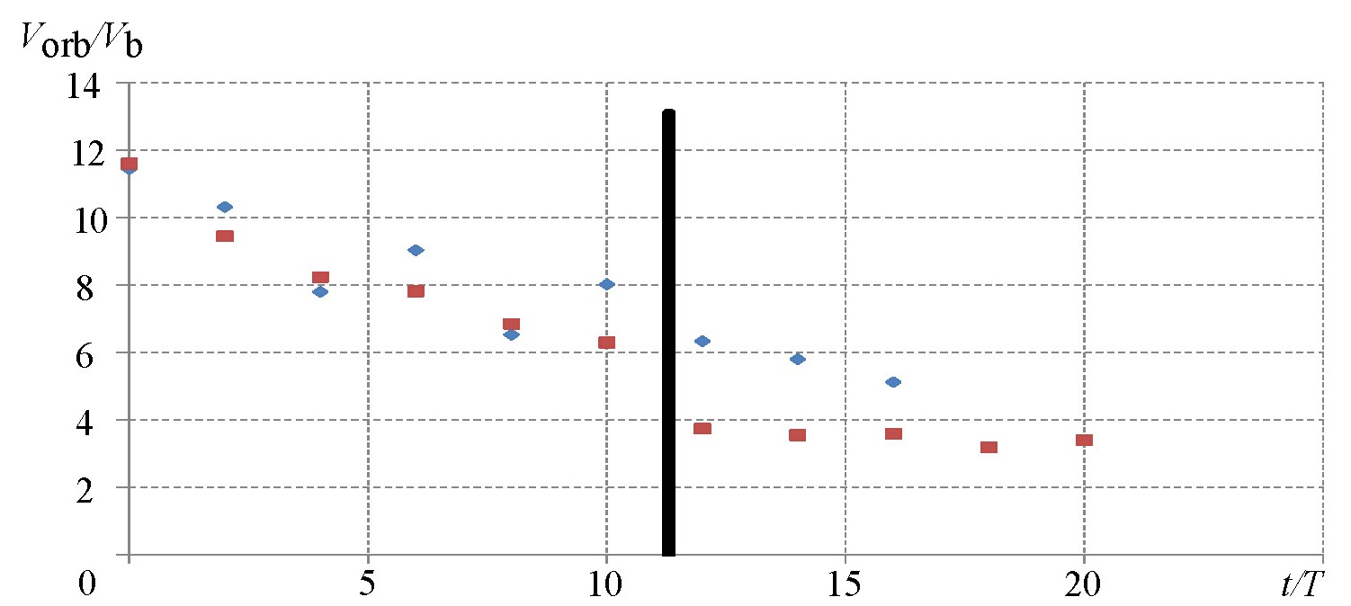 F i g. 6. Dependence of Vorb /Vb on t/T. Blue diamonds denote the experiment over the cone with a smooth surface, red squares – the experiment over the cone with a ridge. Thick black line shows the moment when the current front passes over the ridge. Salinity of water in the tank S=2‰ (Source 3)