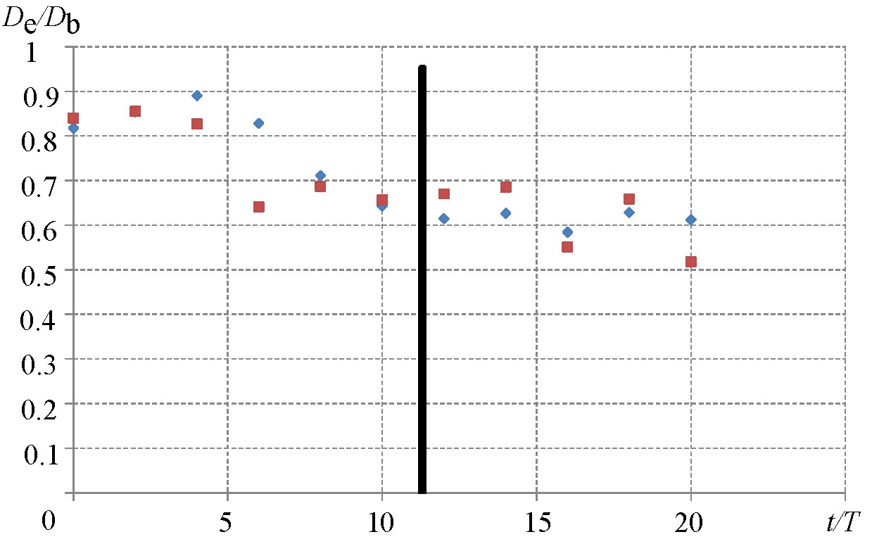 F i g. 7. Dependence of De /Db on t/T. Blue diamonds denote the experiment over the cone with a smooth surface, red squares – the experiment over the cone with a ridge. Thick black line shows the moment when the current front passes over the ridge. Salinity of water in the tank S=2‰ (Source 3)