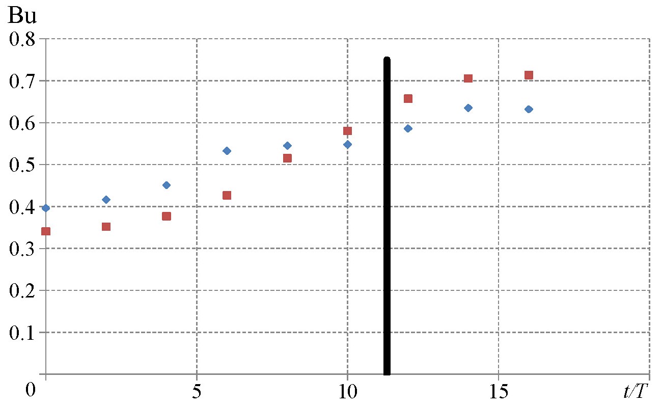 F i g. 8. Dependence of Bu number on dimensionless time for S=2‰