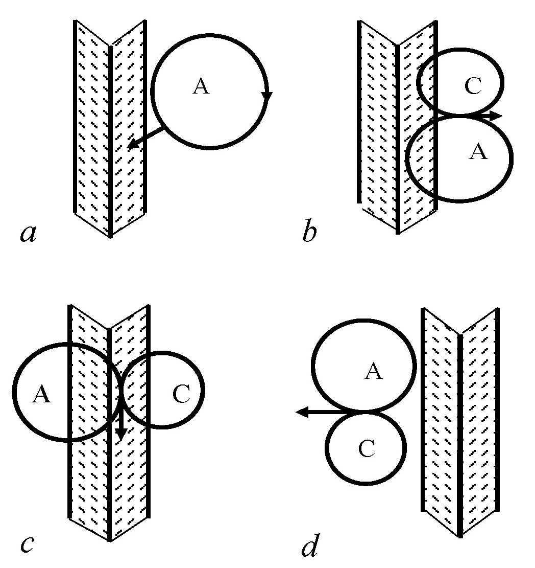 Fig. 9 shows a diagram of anticyclonic eddy passage over the ridge. The moment in time when eddy (A) comes close to the ridge is demonstrated in Fig. 9, a. The anticyclonic eddy moves down the slope creeping onto the ridge and trying to move along the isobath. In this case, cyclonic eddy (C) of smaller diameter is formed above it (Fig. 9, b). This eddy pair tends to move in the cyclonic direction, so the anticyclone motion in the anticyclonic direction slows down. Since an anticyclone is a larger and more powerful eddy compared to a cyclone, it “spins” the latter around itself (Fig. 9, c). Eventually both eddies cross the ridge (Fig. 9, d). Soon after this, the cyclone dissipates and the weakened anticyclone continues to move in the anticyclonic direction due to the topographic beta-effect.
