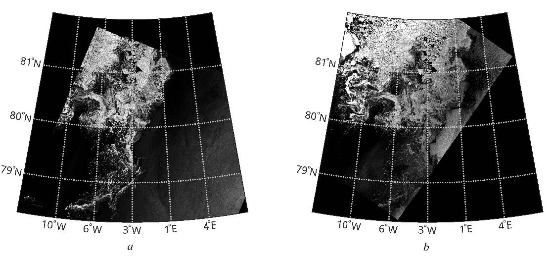 F i g. 1. A pair of Sentinel-1A (a) and Sentinel-1B (b) radar images for 15 September 2018 with the drifting ice present in the marginal ice zone of the Fram Strait