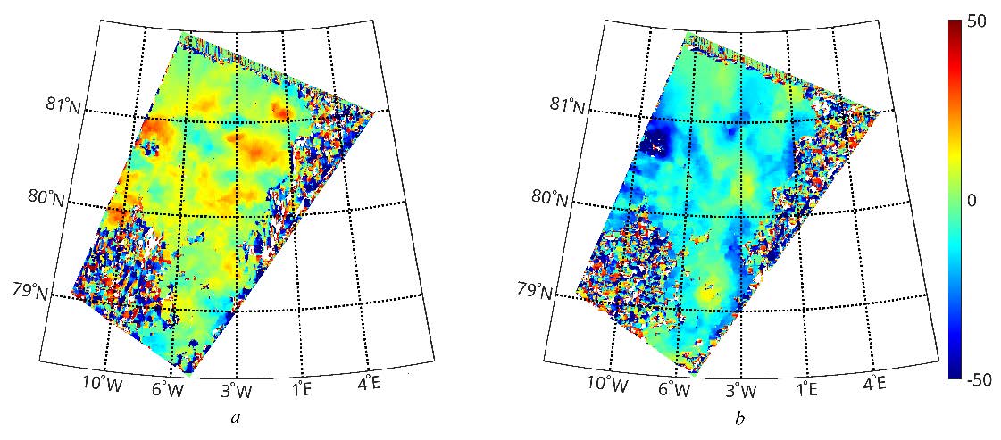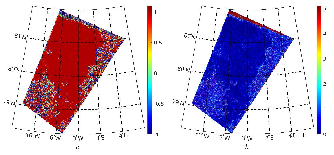 F i g. 2. Pixel shifts corresponding to the velocity field components (a) and (b) and obtained on 26 July 2018 using the MCC algorithm for the Sentinel-1A/B radar images