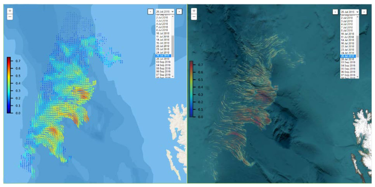 F i g. 7. User interface of the system for visualizing the products with ice drift fields in the marginal ice zone of the Fram Strait for 26 July 2018. On the left is an example of a static display of ice drift fields, on the right – a dynamic field using the Wind-JS library