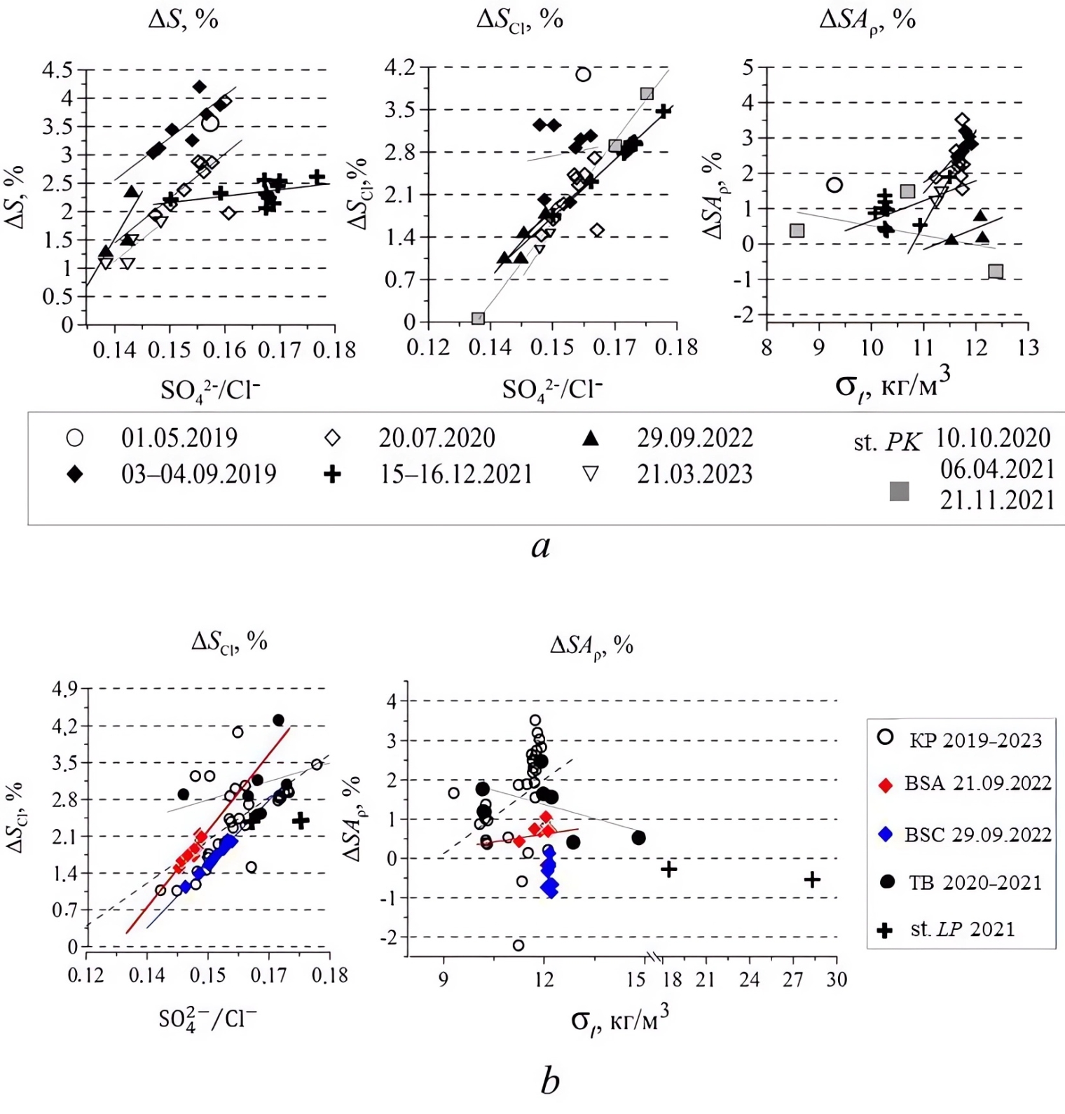 F i g. 3. ΔS, ΔSCl, ΔSAρ and their relationship with the ionic composition and density in the Kerch Strait (KS) waters (separately for 5 expeditions) (a); in the waters of the Kerch Strait (5 expeditions together), as well as the Black Sea (stages BSA and BSC), the Taman Bay (TB) and the lagoon (station LP) (b)