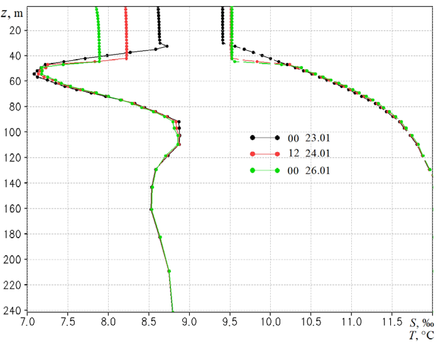F i g. 6. Vertical profiles of temperature T, ℃ (solid line), and salinity S, ‰ (dashed line), at the point with coordinates 32°E, 44°N at 00:00 on January 23, 12:00 on January 24 and 00:00 on January 26, 2010. For clarity, not the very value of S, but the difference (S – 8), ‰, is shown