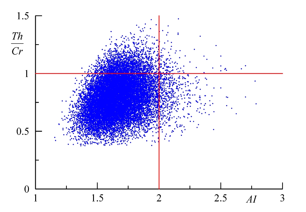 It is noteworthy that negative skewness values can occur when two conditions are simultaneously satisfied, Th/Cr < 1 and AI < 2.