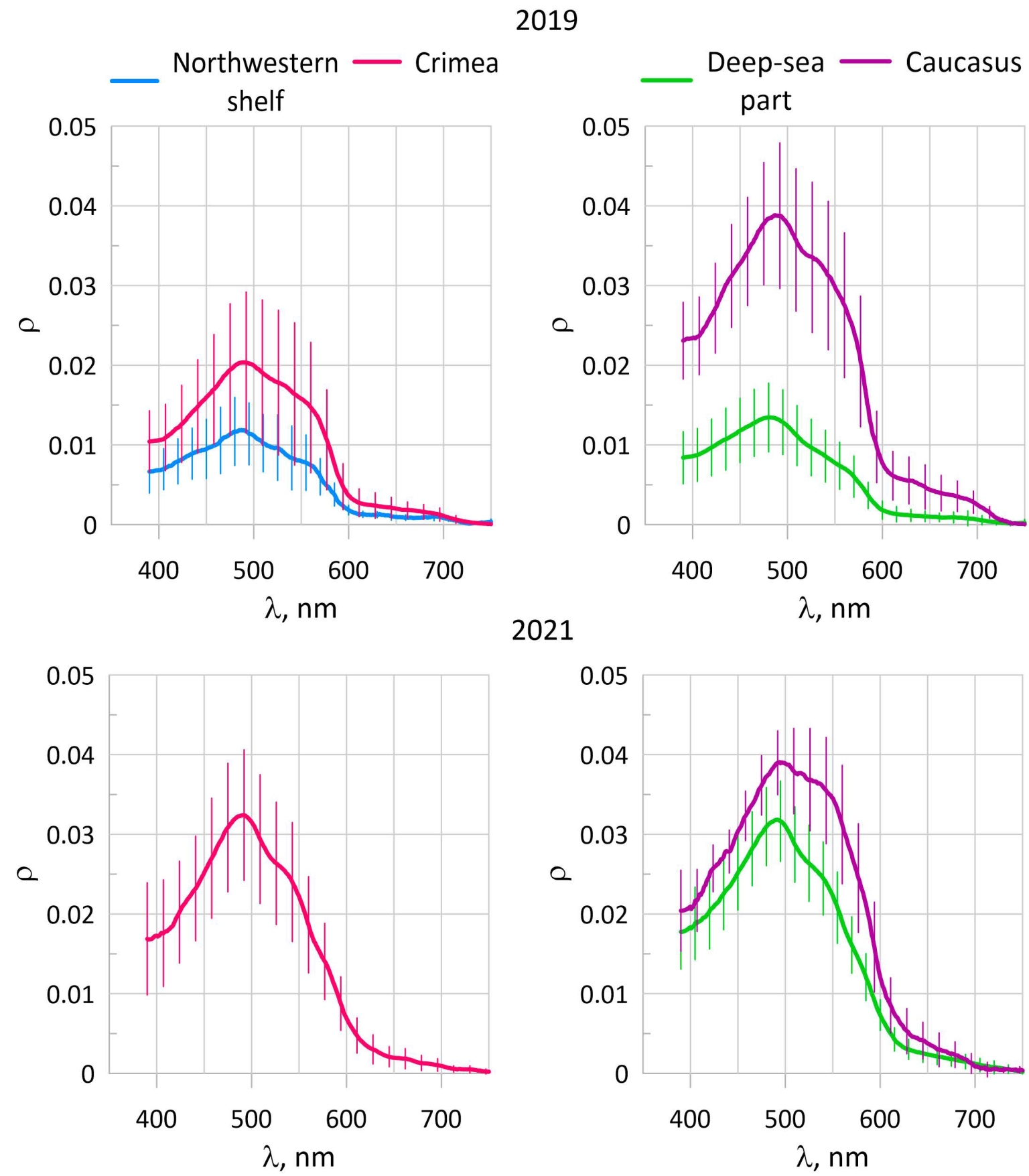 Optical expeditionary measurements were carried out for similar spring periods of 2019 and 2021 which makes it possible to analyze variability of reflectance coefficient and seawater color characteristics.