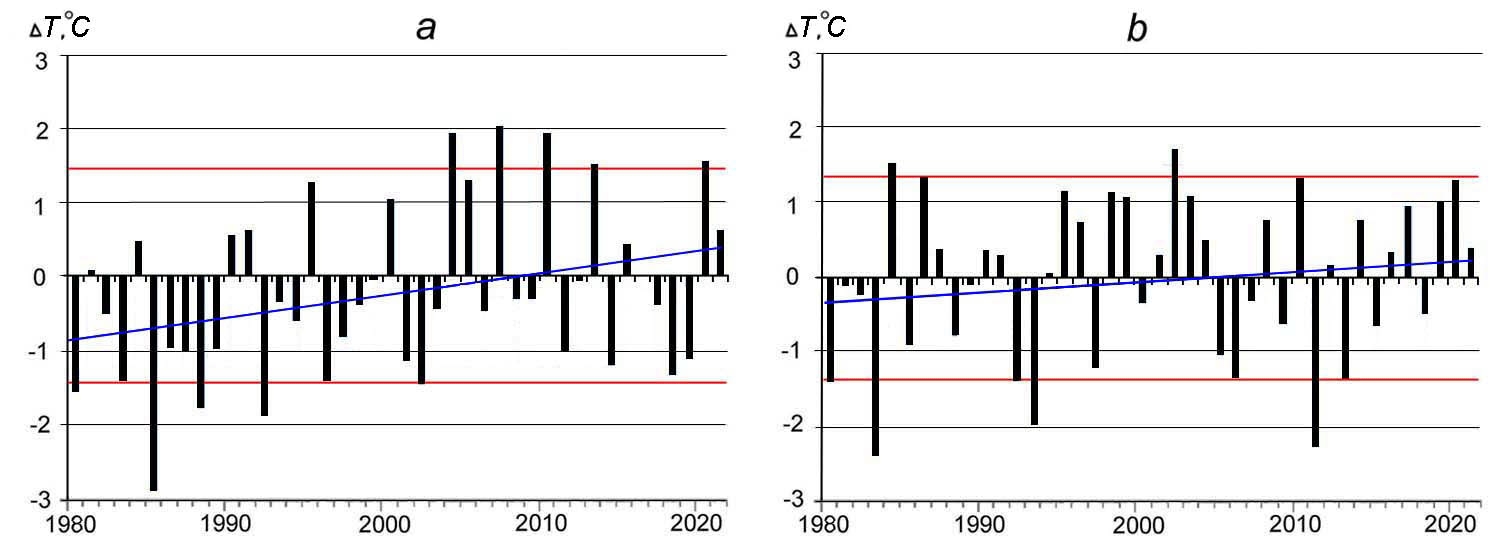F i g. 2. Interannual variability of water temperature anomalies in the western, HMS Kholmsk (a), and eastern, HMS Cape Terpeniya (b), areas of the Sakhalin shelf (blue lines denote the linear trends, red ones – the criteria of large anomalies)