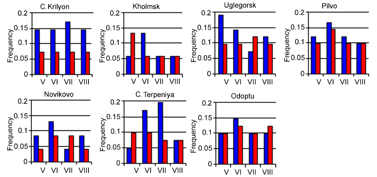 According to the calculation results presented in Fig. 3, the frequency of arising of large negative anomalies in water temperature prevails at most stations of Sakhalin Island in May – August 1980–2021. It should be noted that the risk of severe cold snaps is especially important in May–June, when the salmon fry migrate to coastal areas.