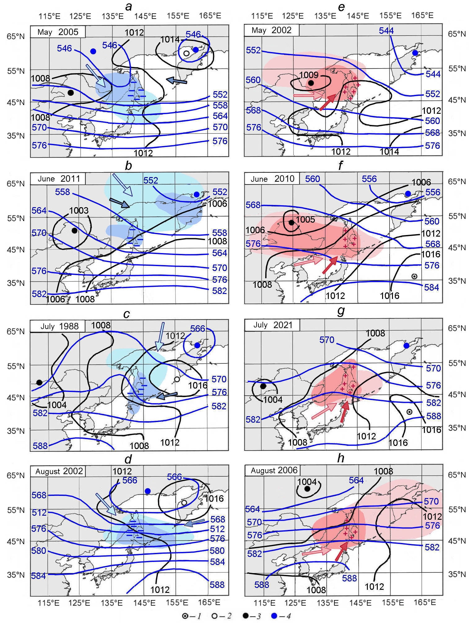 F i g. 4. Typical structures of the surface baric fields P0 (black isobars, hPa) and geopotential Н500 (blue isohypses, hPa) in the yeas of formation of large negative (а – d) and positive (e – h) water temperature anomalies. 1 – Hawaiian High, 2– Okhotsk High, 3 – Summer Far East Low, 4 – Troposphere Low. Light blue and pink arrows denote the direction of basic motion of the cold and warm air masses in the mid troposphere, blue and red ones – the motion direction in the near land layer; signs “−” and “+” show the negative and positive anomalies of water temperature; light blue color marks the centers of negative anomalies of geopotential Н500 and pink color – the centers of positive anomalies of geopotential Н500; blue and red colors show the centers of abnormally low and high air temperature, respectively