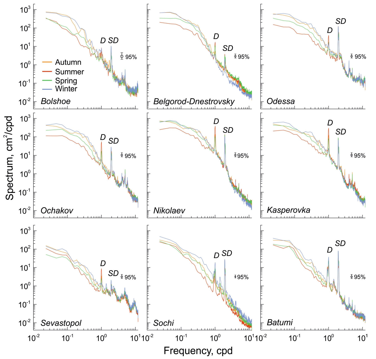 The diurnal peaks in Fig. 2 apparently have a significant contribution from the radiation component. As a result, the peak with a frequency of 1 cycle/day varies greatly throughout the year: in winter it is the weakest and at some stations (Ochakov, Nikolaev, Sevastopol) it is even absent. In summer, this peak reaches maximum energy values even exceeding the semi-diurnal tidal peak at Ochakov, Nikolaev, and Kasperovka. It should be noted that seasonal variability of the diurnal peak at most stations is in antiphase to the nature of the seasonal variability of the spectrum continuous part in the frequency range of 0.2–2 cycle/day.