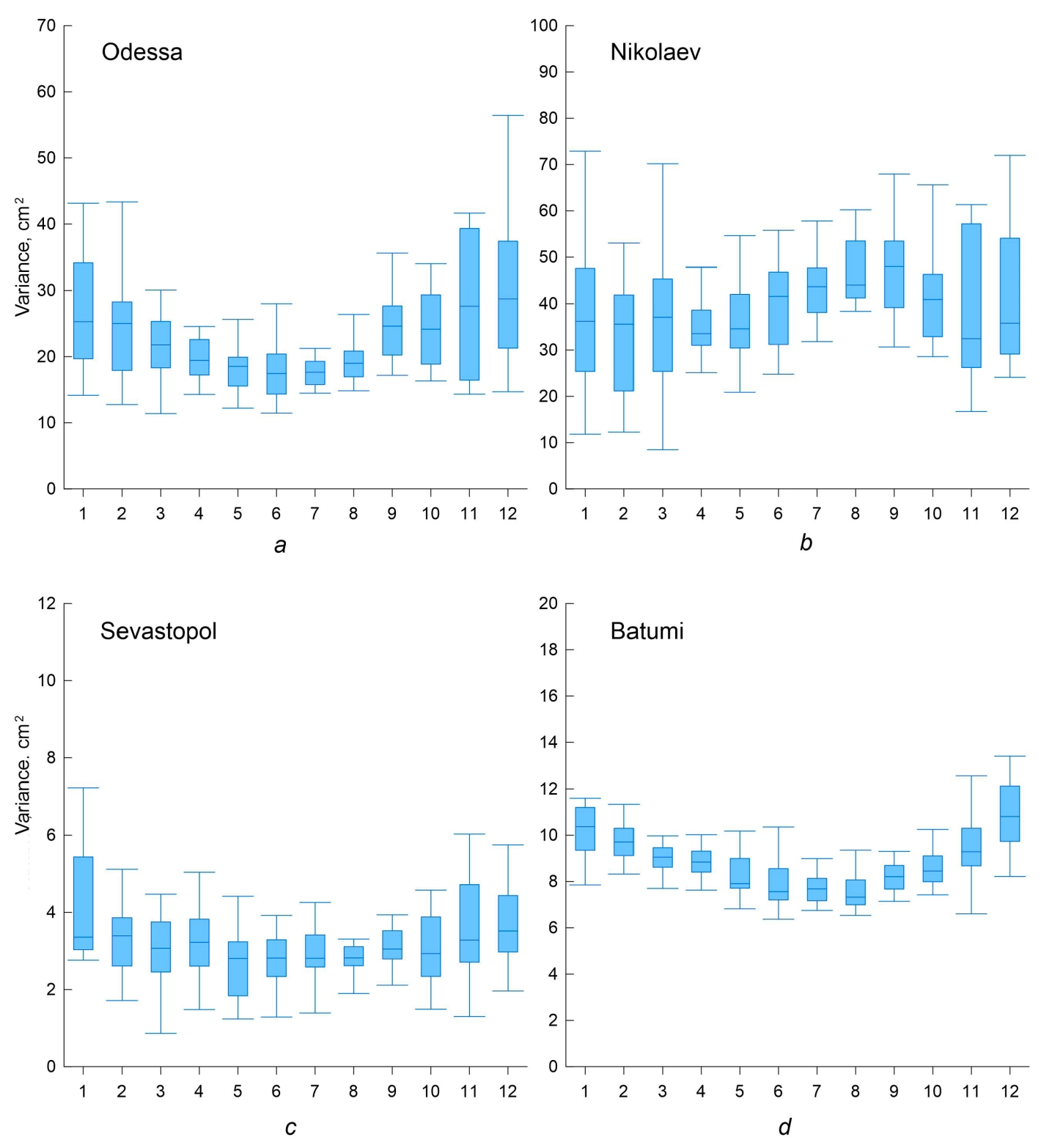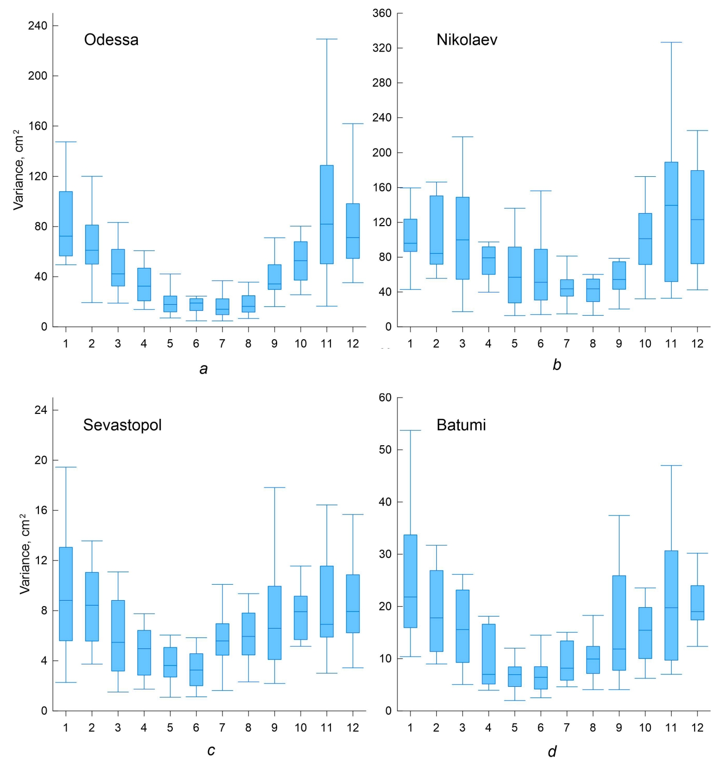 The mesoscale variability range is characterized by different box plots of variance estimates of sea level oscillations (Fig. 4). The maximum values are observed in autumn and winter. The minimum values of the median variance in Odessa, Sevastopol, and Batumi are typical for May – August. In Nikolaev, the lowest variance values are observed in April, May, and November. The spread of variance values at three stations (Fig. 4, a, c, d) decreases from winter to summer and increases from summer to winter. Nikolaev is characterized by atypical histograms with an increase in median variance values from May to September followed by a decrease in the median and an increase in variance by November – December.