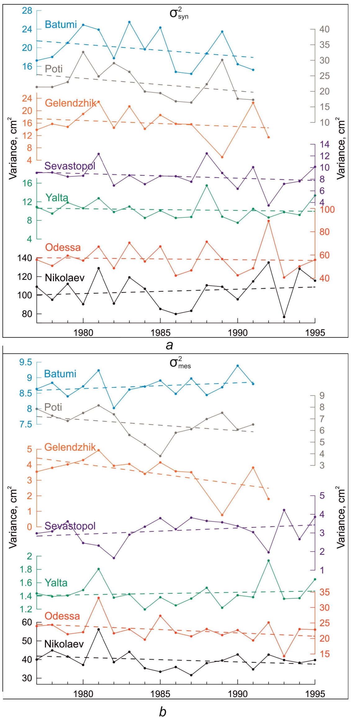 F i g. 5. Interannual changes of variance of the synoptic (a) and mesoscale (b) Black Sea level oscillations at the stations Batumi, Poti, Gelendzhik, Sevastopol, Yalta, Odessa, and Nikolaev. The dashed line shows long-term linear trends