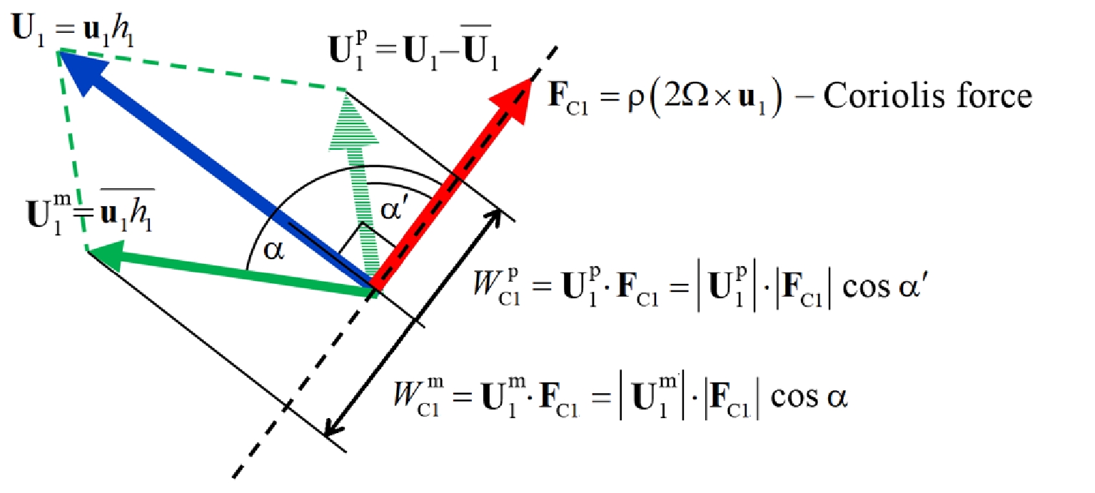 F i g. 3. Appearance of non-zero values of the Coriolis force work (WC1m=WC1p0) at decomposing the flows into a sum of the average u1h1¯ and pulsation u1h1' values