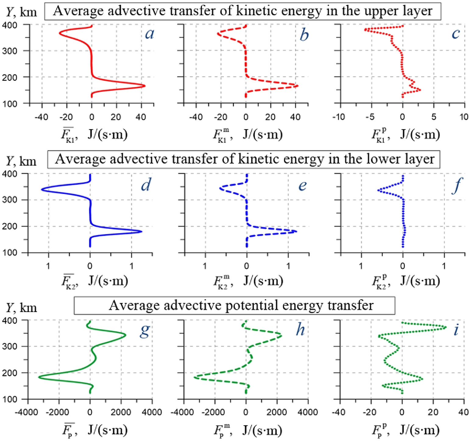 Fig. 4 shows the distribution of advective energy flows along the Y axis. In the upper layer, the maximum average transfer of kinetic energy is observed in the average Rim Current core (Fig. 4, a). The energy transfer direction coincides with the current direction. The main contribution to the kinetic energy advection is made by MC (Fig. 4, b), the maximum FK1m coincides with the mean flow core.