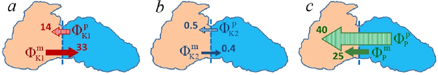 F i g. 5. Total advective energy flows (MJ/s) between the eastern and western parts of the sea: ΦK1m, ΦK1p (a); ΦK2m, ΦK2p (b); ΦPm, ΦPp (c)