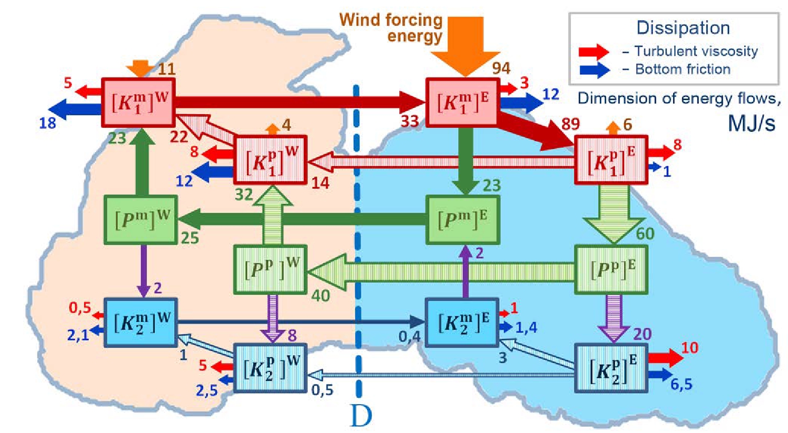 An important feature of the scheme presented, linking all its elements together, is the presence of the advective energy flows discussed above, directed from one part of the sea to the other (Fig. 5). On the one hand, it can be said that these advective flows compensate for differences in the size and direction of energy transitions in the western and eastern parts. On the other hand, these advective energy flows, being a consequence of the β-effect, are the main reason for the uneven distribution of energy transitions across the sea.