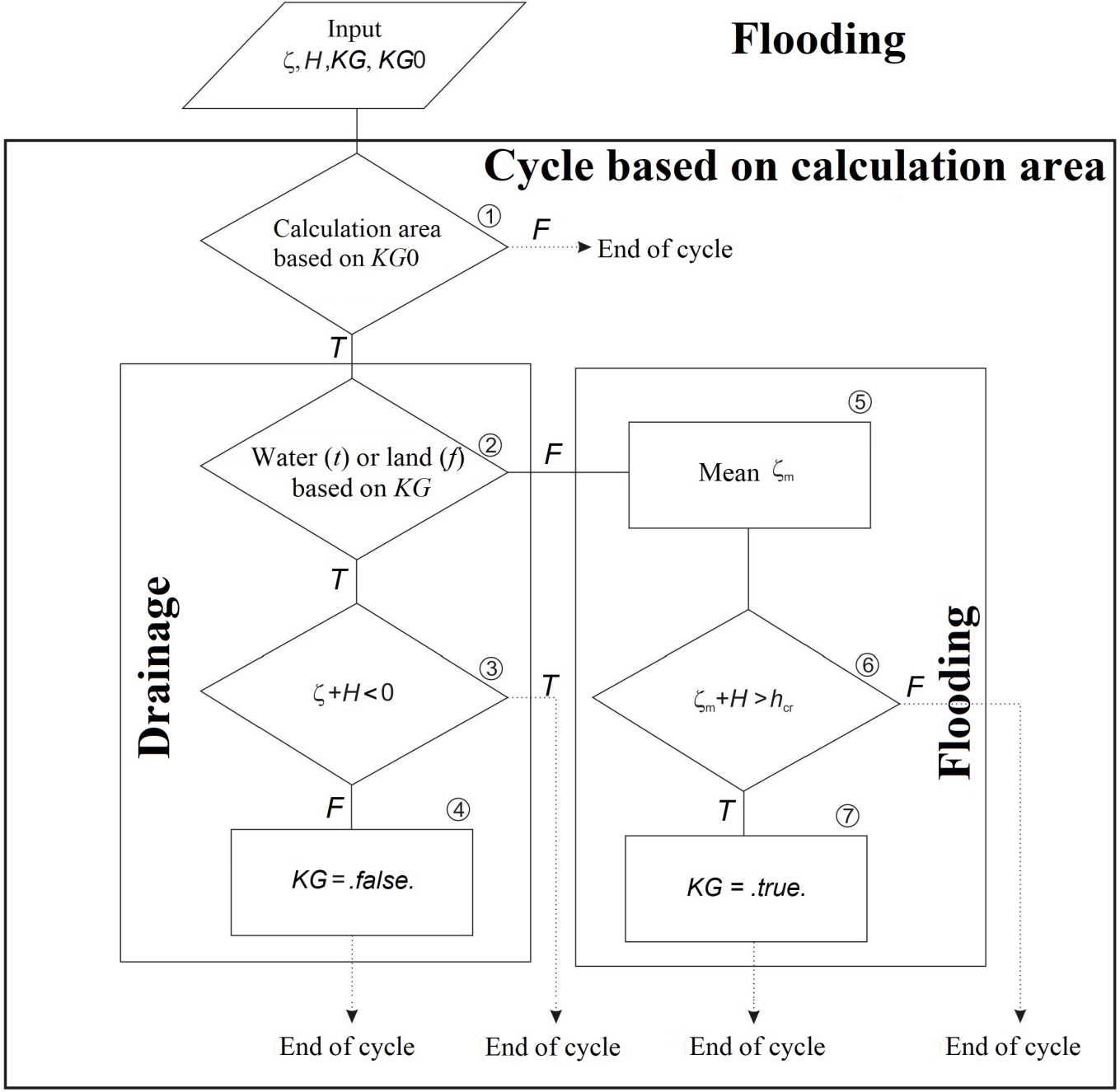 Fig. 1 shows a block diagram of the algorithm for determining the water body shoreline in the case of surges. The algorithm is based on determining the water body depth depending on the value of the water surface level difference. When iterating over all calculation cells based on the values of logical variable KG0, those that are obviously not included in the calculation area are immediately discarded (KG0 = false). Then, KG variable makes it possible to determine which process is taking place in the cell: drainage, flooding, or none.