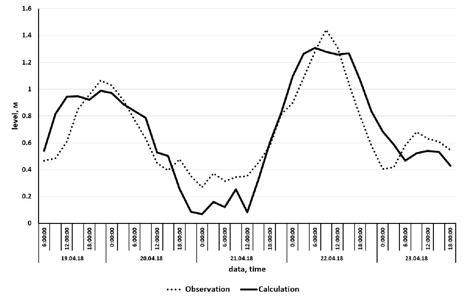 F i g. 2. Changes of water level in Donskoy from 19 April 2018 to 23 April 2018