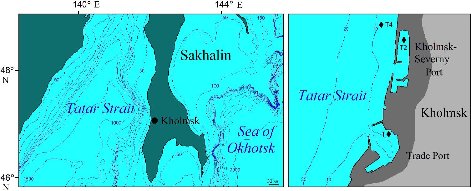 The Tatar Strait near Kholmsk is generally characterized by a relatively weak manifestation of frequency-selective properties of the water area determined by topography: the shelf near Kholmsk is the narrowest and deepest off the western coast of Sakhalin, it expands both in the southern and in the northern directions. The shelf width in the Kholmsk area is ~ 40 km, the bottom slope is 0.0078.