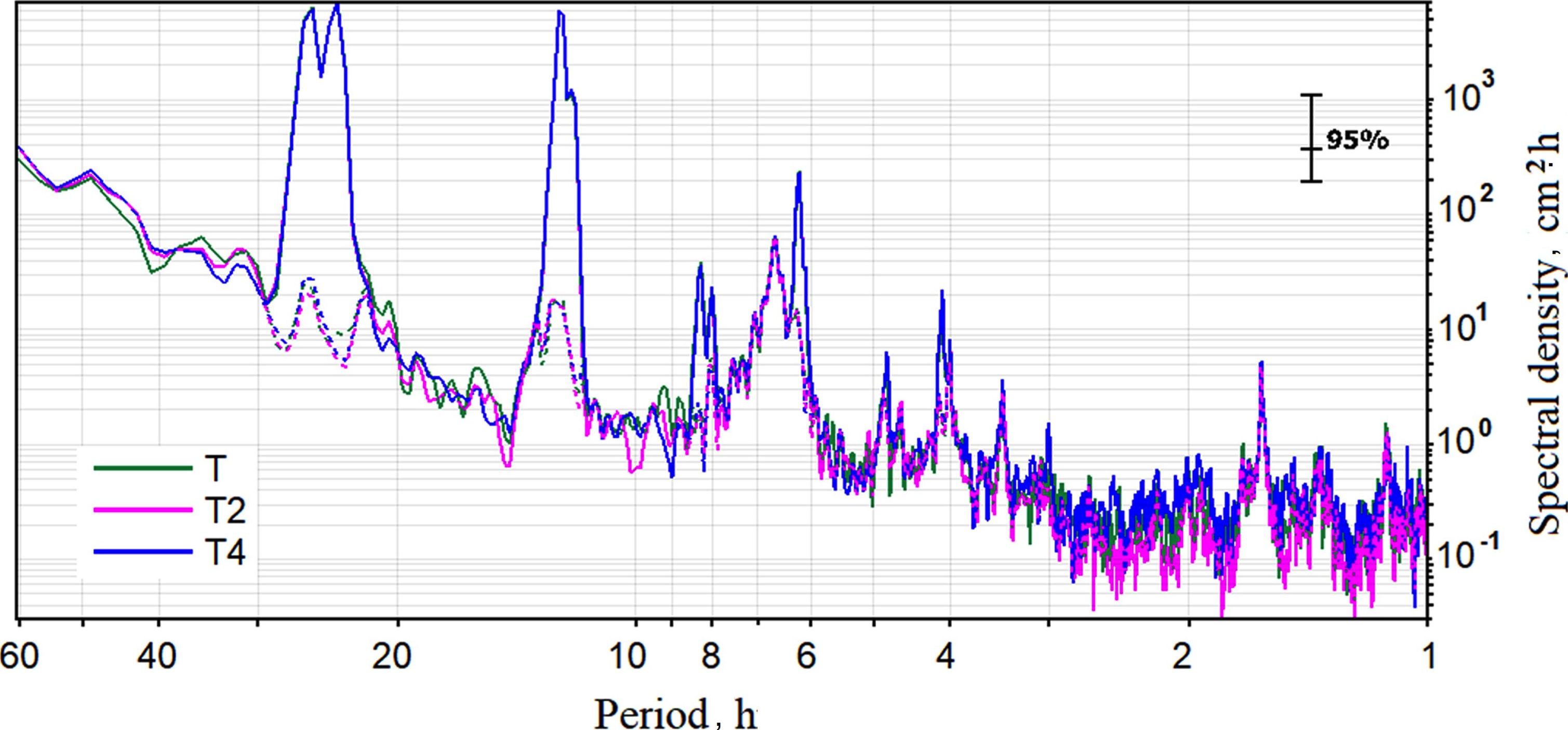 The periods of maxima in the spectral densities of sea level oscillations are given in Table 1. This table also compares the values of the obtained periods and similar values of the periods of tidal harmonics according to the monograph [2]. Spectral peaks that do not have periods close to tidal harmonics can be attributed to wave processes of a different, non-tidal nature.